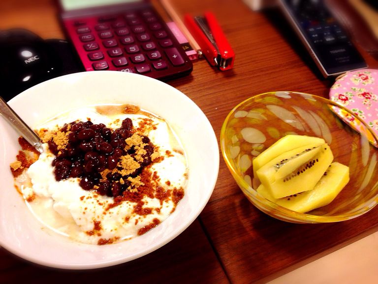 そんなパソコン前の私のおやつヨーグルトと小豆のきな粉がけゴールドキウイ…変ですか…?