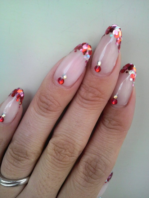 今回は先端に赤、ピンク、オーロラのホログラムをランダムにのせてフレンチネイル風に