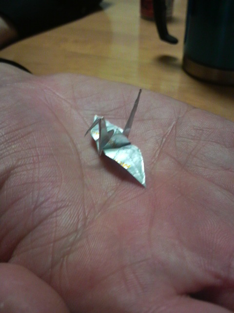 スタッフルームにアメの包み紙で作られた鶴がありました。