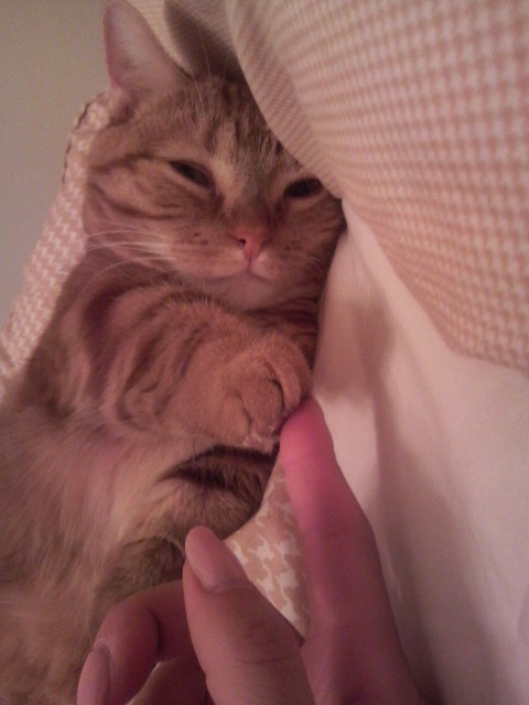 私がベッドに横になっていたら、メルが喉を鳴らしながら隣にきました~~!