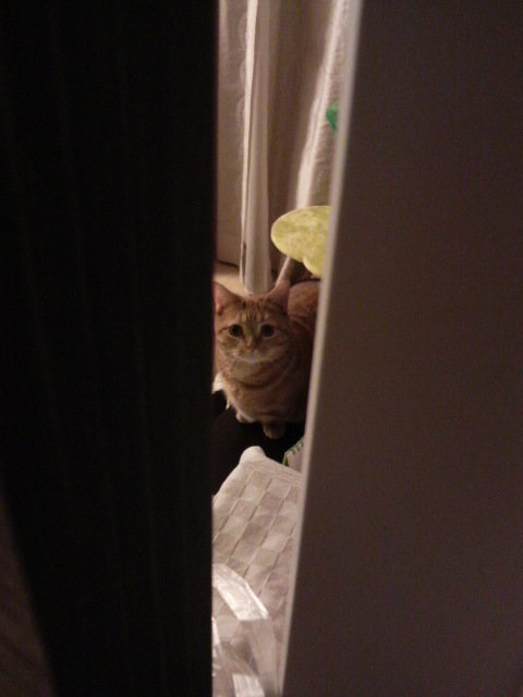 ドアの隙間からビニールの紐をチョロチョロ出してみたら、メルは興味津々のようです