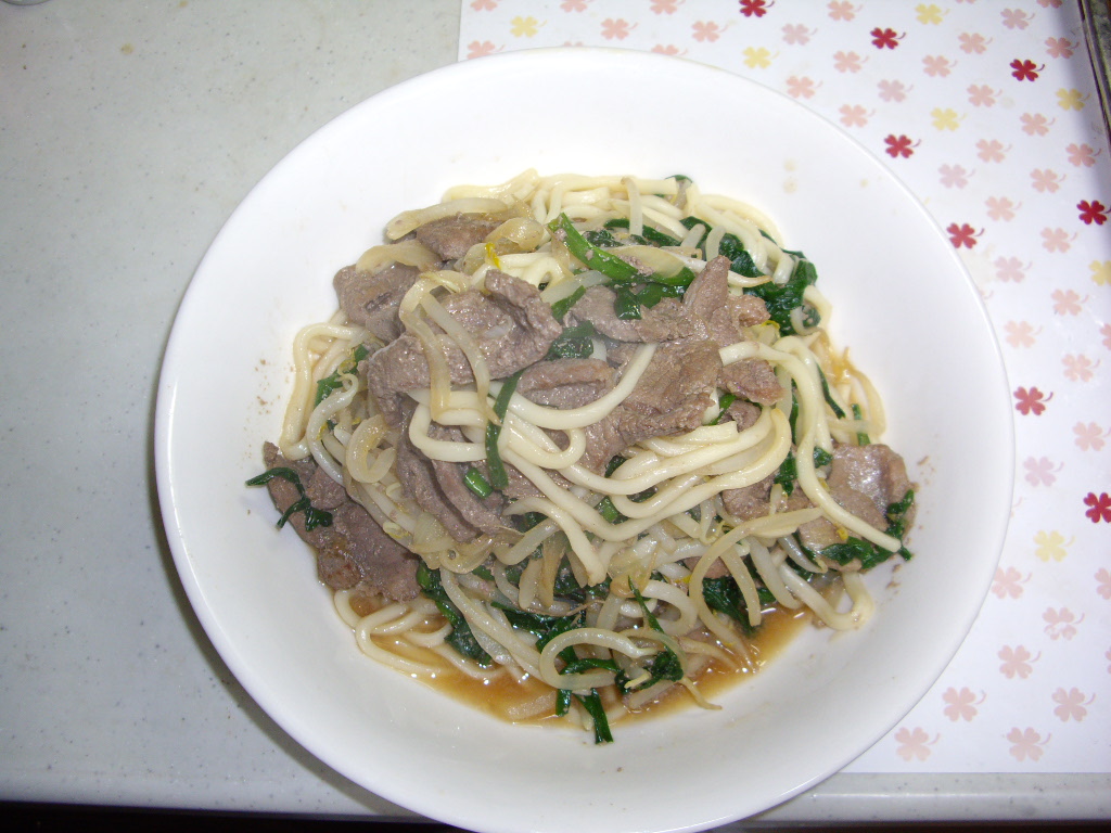 カオリ先生に「うどん入れると美味しいよぉ~~」と言われたので、うどん、そして他にも、もやし、ニラ、玉ねぎとあわせてみました。